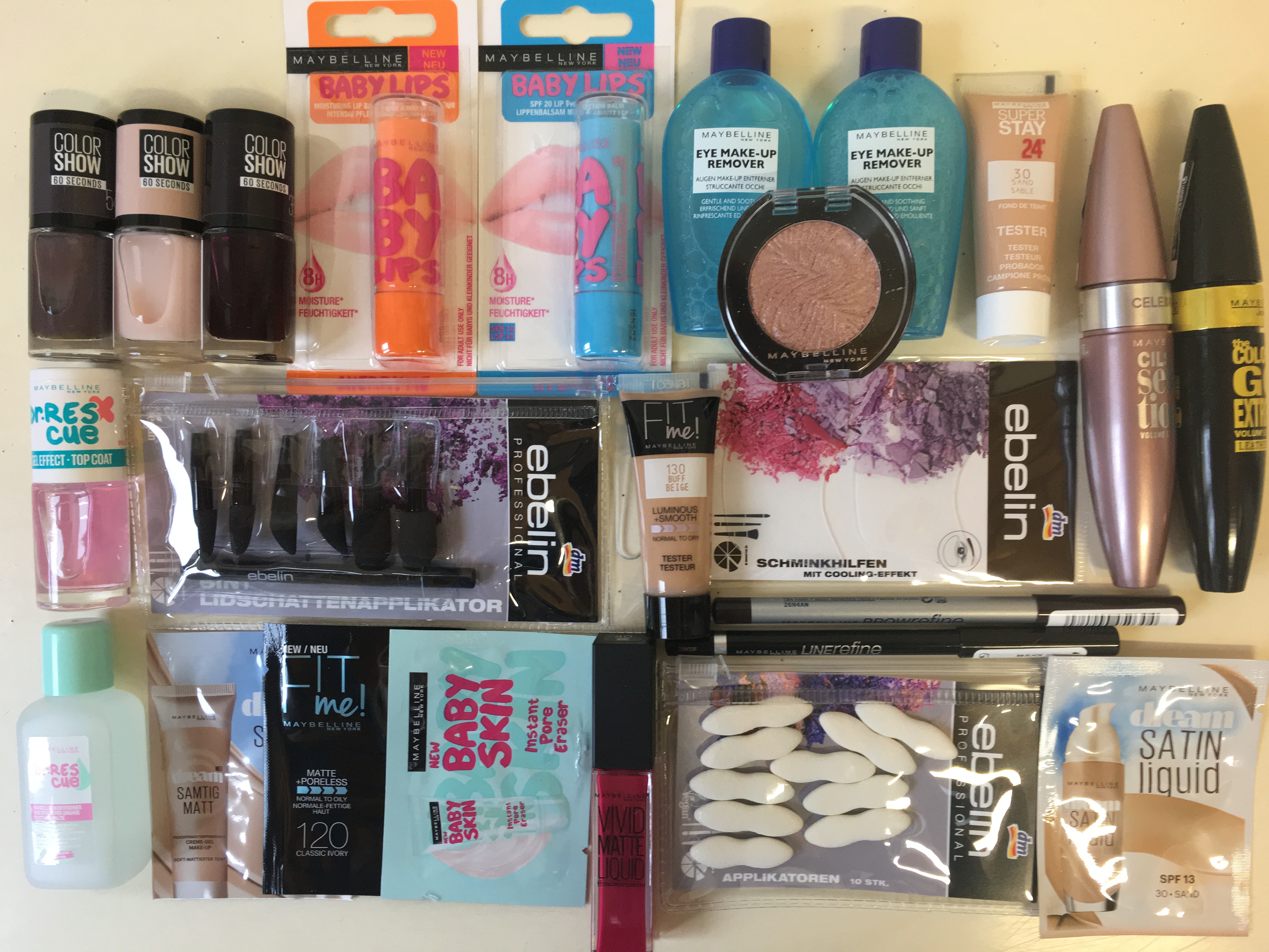 Mascara (Go Extreme und Cils Sensational), 2 Liquid Foundation samples, 1 Crème Gel Make-up sample, 1 Primer sample, 2 small bottles eye make-up remover, 1 eyeshadow, colour Copper Fizz (23), 2 x Lipbalm Baby Lips, 1 eyebrow pencel (dark brown), 1 eyeliner pencil (black), 3 x nail lacquer Color Show 60 Seconds in the colours Burgundy Kiss (357), Peach Pie (31) and Midnight Taupe (549), 1 top coat Dr. Rescue, 1 small bottle nail polish remover, 1 pack with applicators, 1 pack with eyeshadow applicators, makeup pads with cooling-effect for the eye area, 1 lipstick Vivid Matte Liquid in a nice berry tone, 1 Tester Fond de Teint Super Stay 24 und 1 Tester tinted day creme Luminous+Smooth. Matter of expense, about 29,99 EUR.