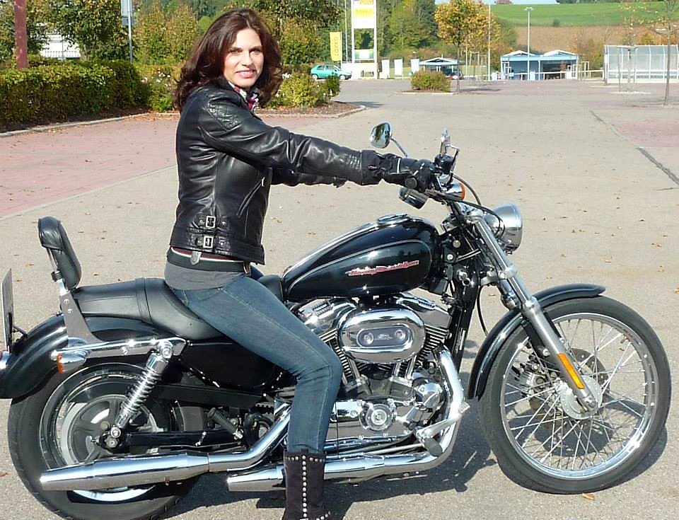 Vor ein paar Jahren lernte ich dann eine wirklich nette Frau kennen, die mit 42 gerade ihren Motorradführerschein machte und mir begeistert vorschwärmte, wie toll es ist, Harley zu fahren. Zudem Mitglied in einem Harley-Stammtisch in München. Da kam mir doch gleich das Klischee von Rockerbande und Schlägertrupp in den Kopf. Hilfe, auch das noch. Aber keineswegs. Ich traute mich in die Runde und hatte richtig Spaß. Der Stammtisch wurde zu meinem Highlight und der der Sound von 20 Harleys Musik in meinen Ohren. Als ich meinen 50. Geburtstag feierte, stand der Entschluss dann fest: ich muss so ein Bike haben und selbst fahren. Meinen Mann hatte ich schnell überzeugt und meldete mich zum Motorradführerschein an. Die Theorie hatte ich ruck zuck mit 0 Fehlern bestanden – boah war ich stolz! Auch in der Praxis überzeugte ich und hatte unsagbar viel Spaß und zu meiner Verwunderung überhaupt keine Angst. Ein knappes halbes Jahr später schaffte ich den Führerschein auf Anhieb und kaufte mir eine Sportster 1200 Custom, 67 PS, 260 kg schwer. Leute, ein richtig fettes Harley Teil. Klar, dass da das entsprechende Harley-Davidson Outfit nicht fehlen darf. Natürlich mit Original Harley-Davidson Lederjacke, Bikerhose und Lederstiefeln! Nur bei den Harley typischen Jet Helmen habe ich so meine Bedenken und bevorzuge einen Integralhelm, der meinen Kopf optimal schützt. Aufgrund der fehlenden Knautschzone ist es sowieso unerlässlich für andere Verkehrsteilnehmer mitzudenken und voll konzentriert zu fahren. Klar mache ich das und genieße ohne Ende unsere Touren. Endlich können wir das wieder gemeinsam und verbinden unsere Harley-Ausflüge meistens mit Kaffee trinken oder einem gemütlichen Biergarten Besuch. Es ist einfach unglaublich schön und wer denkt, dass man mit ü 50 zu alt für ein neues, aufregendes Hobby ist, der liegt komplett falsch! Einmal Gänsehaut Feeling pur bitte! Mädels traut euch was!“