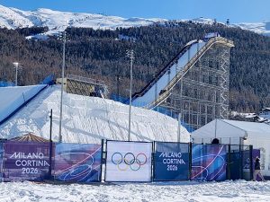 Die gute Nachricht: Abgesehen von einigen riesigen Tribünenaufbauten ist in beiden Orten alles bereit und einige Sportler*innen sind auch schon angereist. Gott sei Dank hat es noch rechtzeitig ausreichend geschneit. Die Wettkampfstätten, wie die legendäre „Pista di Stelvio in Bormio (3 Kilometer lang und teils über 60% steil) sind abgesperrt und schon top präpariert. Gleiches gilt für die nebeneinander liegenden Slopestyle- und Skicrosstrecken, die Halfpipe und die Sprungrampe im schönen Chalet-Örtchen Livigno. Die fünf mächtigen Kicker im Mottolino Snow Park stechen geradezu magisch hervor und die benachbarte Big-Air-Rampe ist über 40 Meter hoch. Im Festivalbereich grüßen Iglu-Zelte, eine Bühne und vorallem eine imposante Schneeskulptur mit den Olympischen Ringen.