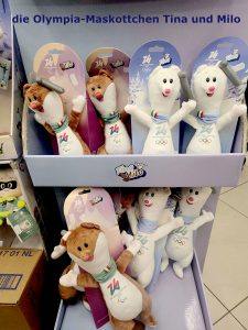 Ein Heer von Freiwilligen in blau-grüner Olympiakleidung bemüht sich um die Gäste und auch die Gastronomie war (noch) entspannt freundlich. Seltsamerweise gab es abgesehen von den beiden Maskottchen „Tina“ und „Milo“ mit den olympischen und paralympischen Logos auf dem Bauch, die ein weißes und ein braunes Hermelin verkörpern, keine Olympiasouvenirs vor Ort zu kaufen. Das kenne ich von anderen Olympiaorten wie Paris oder Salt Lake City ganz anders, wo schon gut ein Jahr zuvor die üblichen Shirts, Kappen, Tassen etc. verkauft wurden. Vielleicht ist mir ein entsprechender Shop im pittoresken Bormio auch einfach nur entgangen.