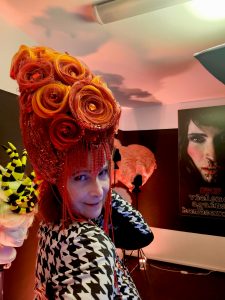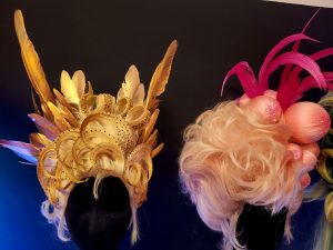 Für einen kurzen Moment plaudern wir zu Dritt über die Neukreationen für die anstehenden Events. Das Funkeln in den Augen ihres Erschaffers ist dabei nicht zu übersehen. Werden Hüte und Fascinators in der Regel entsprechend zum Kostüm hinterher entworfen oder ausgewählt, ist der Kopfschmuck hier so dominant und aussagekräftig, daß es umgekehrt ist – da sind wir uns einig. Bei diesen pompösen Stücken (apropos hat Glööckler schon so eine?) werden Outfit und Makeup als Gesamtkunstwerk untergeordnet bzw. angepaßt.