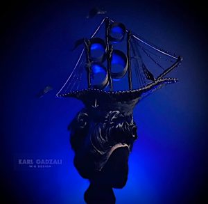 „Das Schiff habe ich für die Fachzeitschrift Top Hair gemacht als Dank für einen mehrseitigen Bericht über mich. Ich wollte da eine klassische Frisur aus dem Rokoko mit meinem Wigdesign zusammenbringen und habe dann den Dreimaster aus Haaren gemacht. Die Frisur trägt den Namen „a la Fregatte“ und da im Rokoko die Haare und Perücken meist weiß gepudert wurden, lag für mich das Schwarz dann ziemlich nah. Mittlerweile ist das Haar, welches die Wellen darstellen soll, auch noch beglitzert“. Soweit der kleine Blick in die Entstehungsgeschichte eines Exponates bzw. in seine Gedankenwelt.